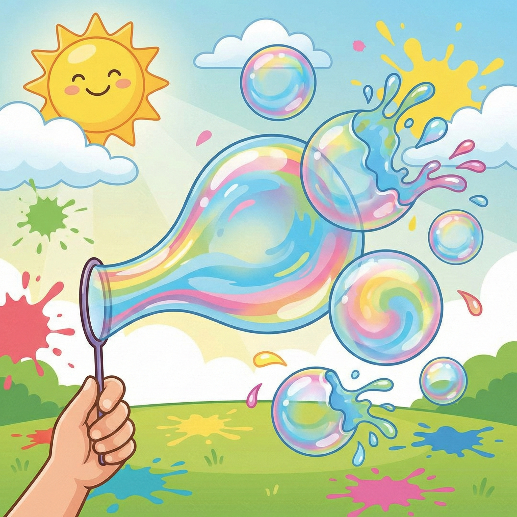 Les enfants attrapent et éclatent des bulles de savon colorées tout en apprenant les couleurs et les actions en français.
