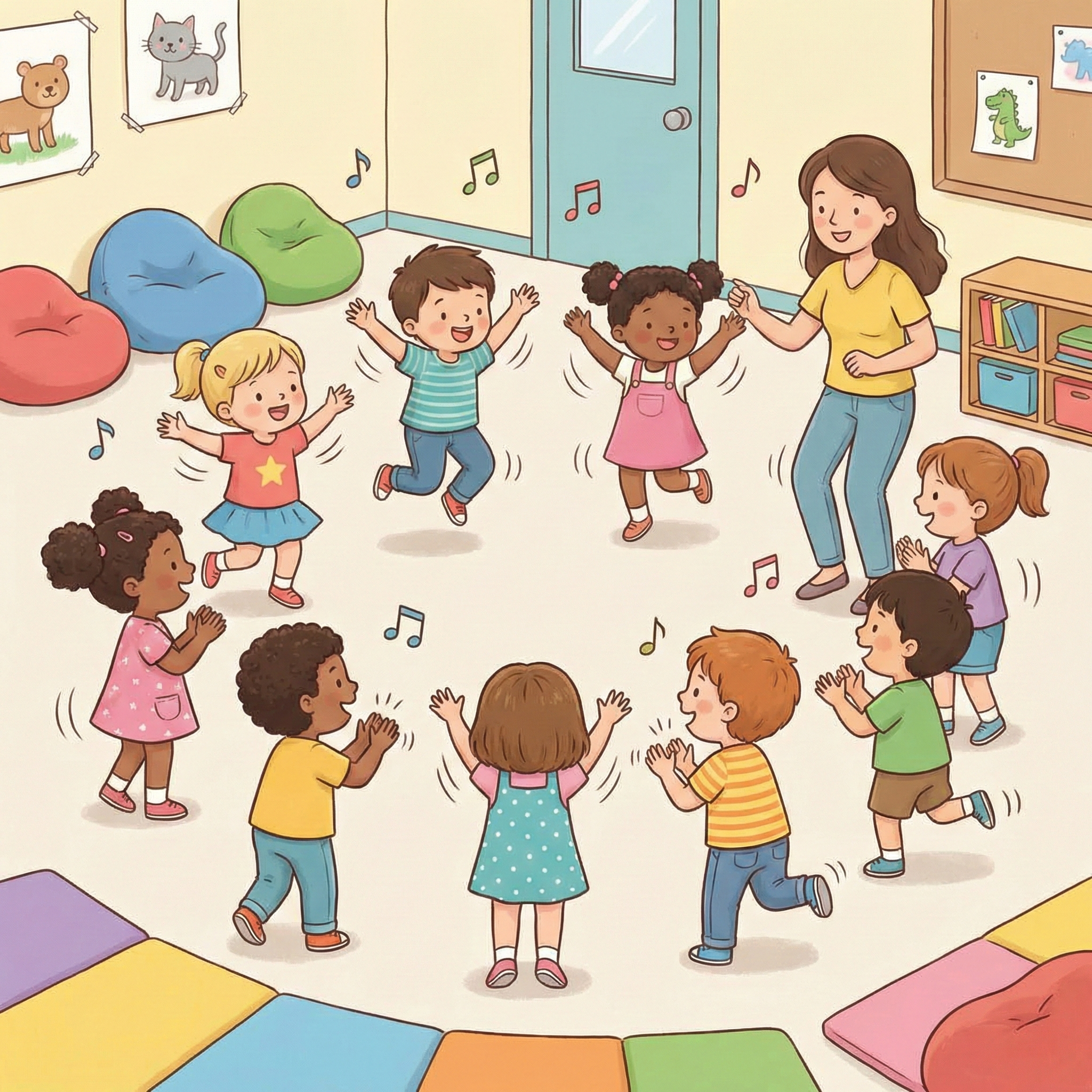 Les enfants chantent une comptine francophone et reproduisent des gestes simples, découvrant ainsi différents accents et rythmes de la langue française.