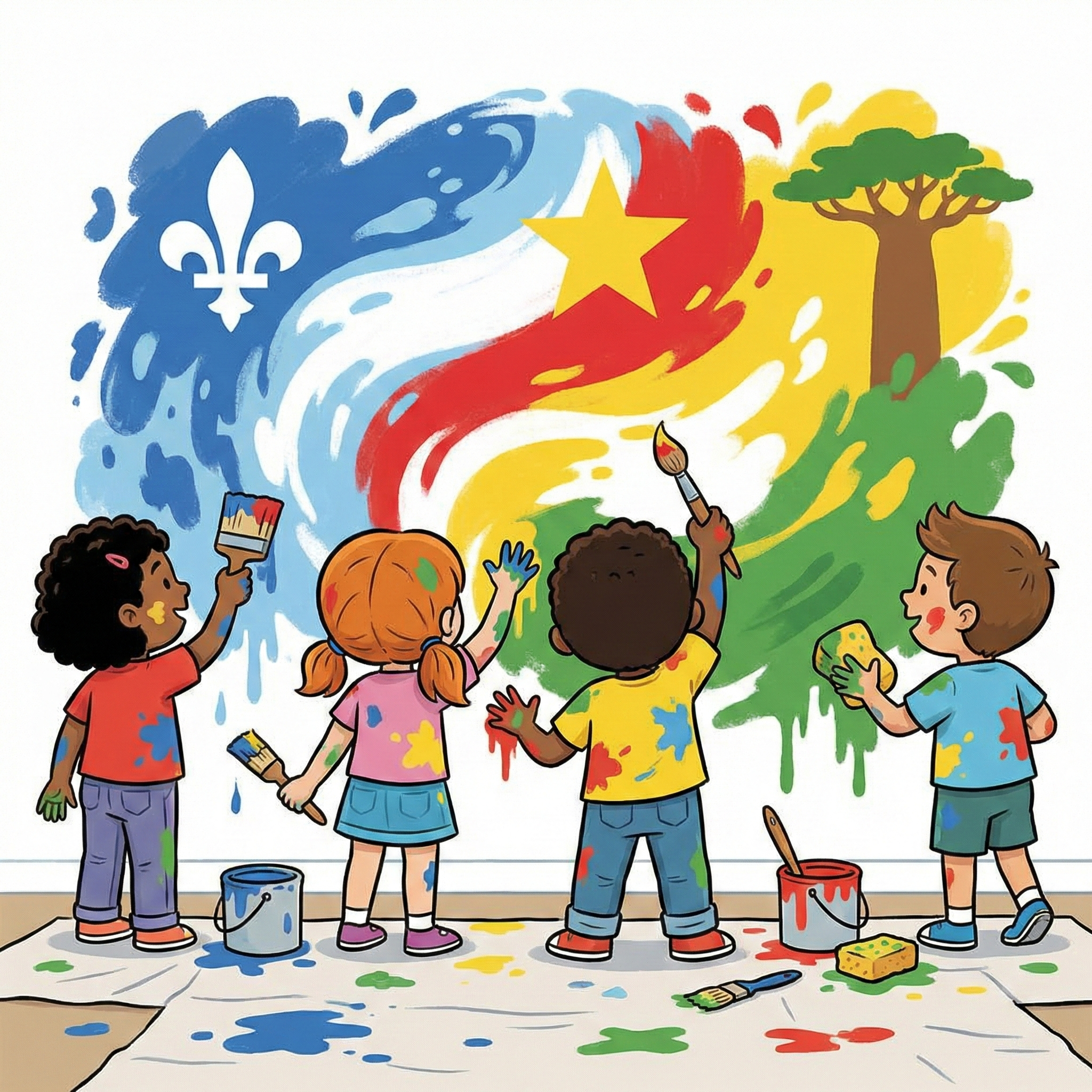 Les enfants réalisent une peinture collective avec des couleurs et des formes inspirées des cultures francophones, en apprenant les mots en français et en partageant leurs idées.